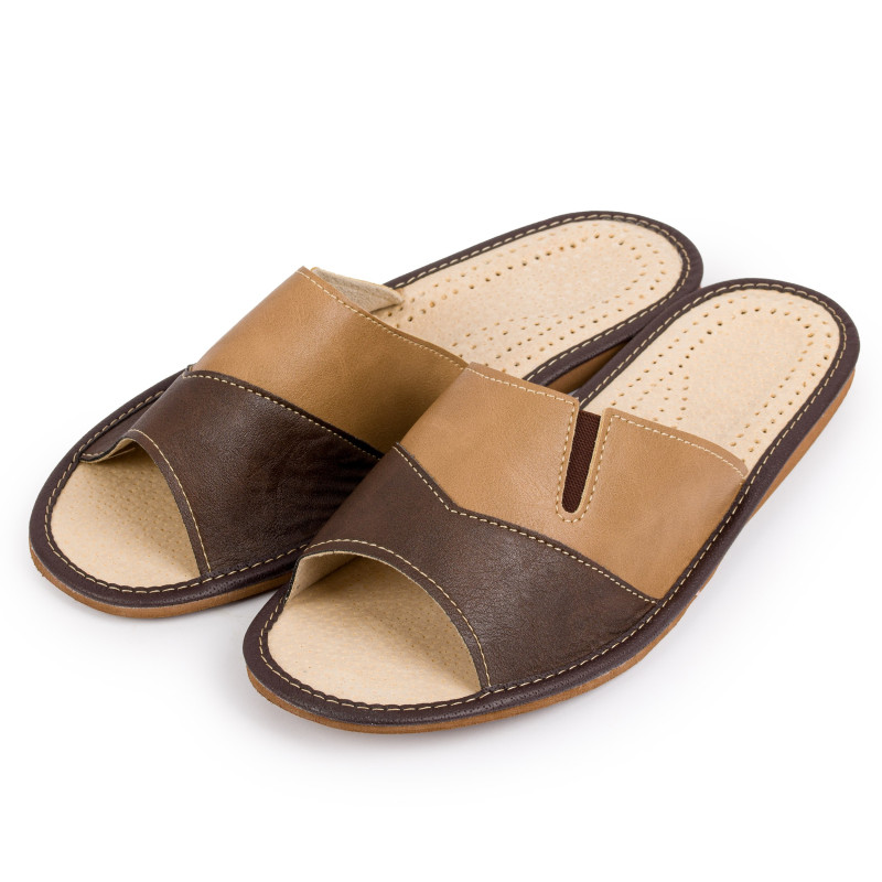 Męskie pantofle R.42 domowe skórzane przewiewne brązowe kapcie z wycięciem KM-11-BR-42