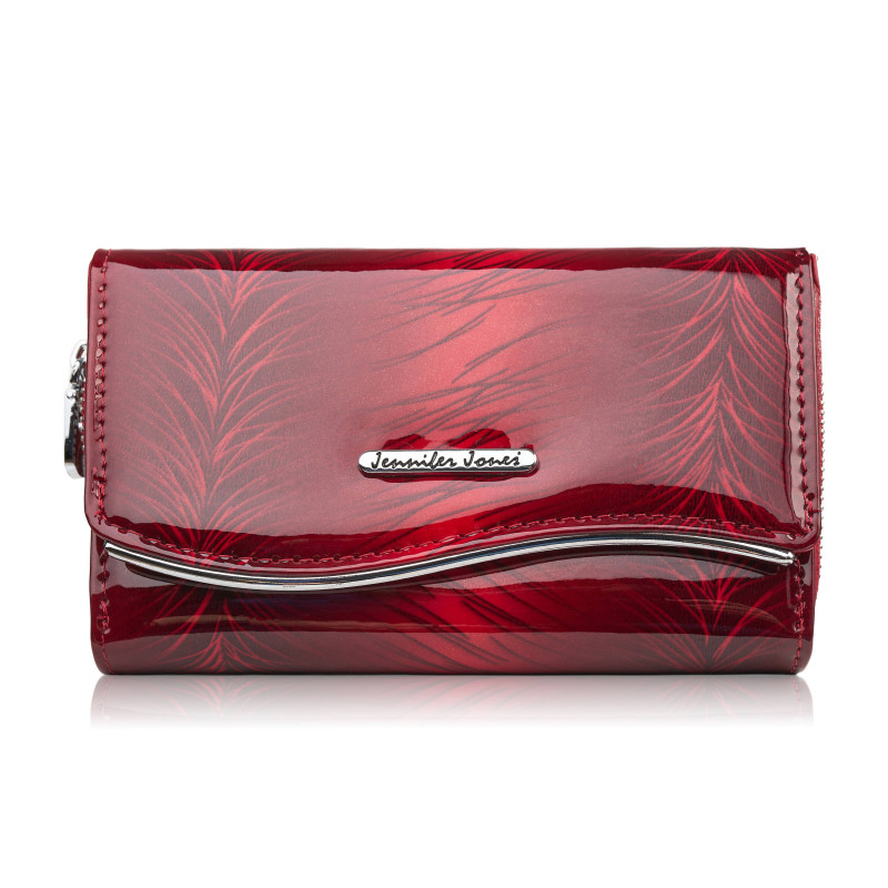 Portfel damski SP-24-RD marki Jennifer Jones to połączenie klasy, funkcjonalności i luksusowego designu. Wykonany z lakierowanej skóry naturalnej z roślinnym wzorem, przyciąga spojrzenia intensywnym czerwonym kolorem oraz efektownym wzorem. To średni portfel damski, który dzięki eleganckiej formie i przemyślanej organizacji wnętrza idealnie sprawdzi się na co dzień.