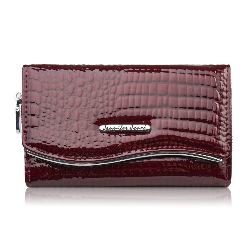 Portfel damski SP-24-CBGD marki Jennifer Jones to połączenie klasy, funkcjonalności i luksusowego designu. Wykonany z lakierowanej skóry naturalnej z tłoczeniem typu croco, przyciąga spojrzenia intensywnym burgundowym kolorem oraz efektowną fakturą. To średni portfel damski, który dzięki eleganckiej formie i przemyślanej organizacji wnętrza idealnie sprawdzi się na co dzień.