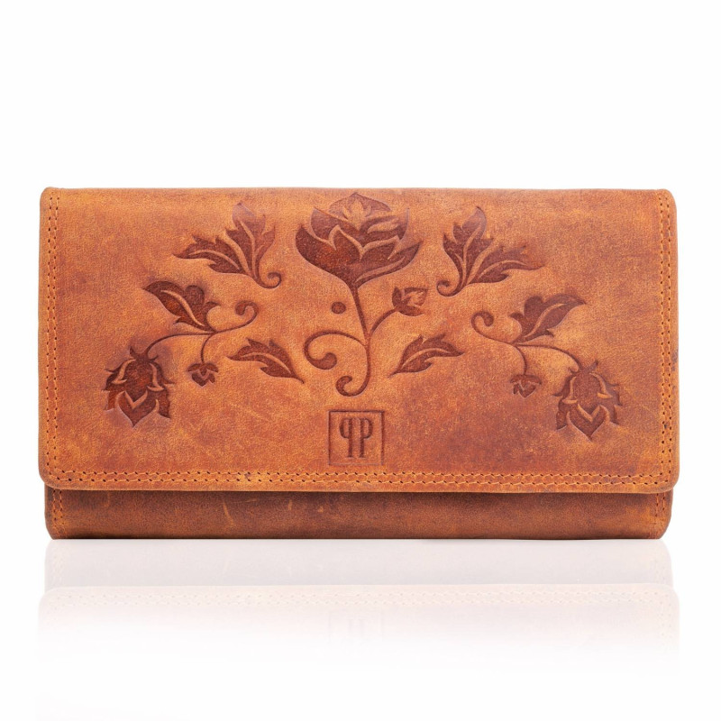 Model T-05-OR to portfel damski w stylu vintage, na którego froncie umieszczono kwiatowe tłoczenia. Dzięki wewnętrznej warstwie RFID, portfel skutecznie zapobiega kradzieżom poufnych danych i personaliów z kart kredytowych poprzez przesył fal radiowych. Czuj się bezpiecznie razem z Paolo Peruzzi. Na wnętrze portfela składa się podwójna komora na bilon (zapinana na suwak), dwie przegrody na banknoty, sześć kieszonek na karty kredytowe oraz półtransparentna kieszeń na zdjęcia lub legitymacje służbową. Co więcej, ten model posiada tył odpinany na patkę, gdzie umieszczono dodatkową transparentną komorę, dwa schowki po długości oraz czternaście przegródek na karty kredytowe.